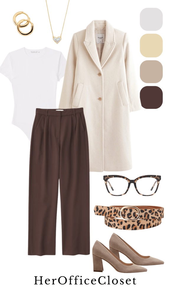 This warm neutral look can be pulled off with brown tailored pants, a light colored body suit and accenting jacket or coat.
