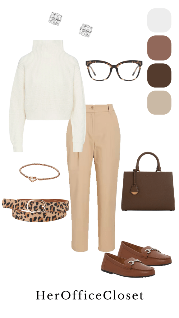This neutral look can be pulled off with a pair of khaki “paper bag” pants a white knit sweater.