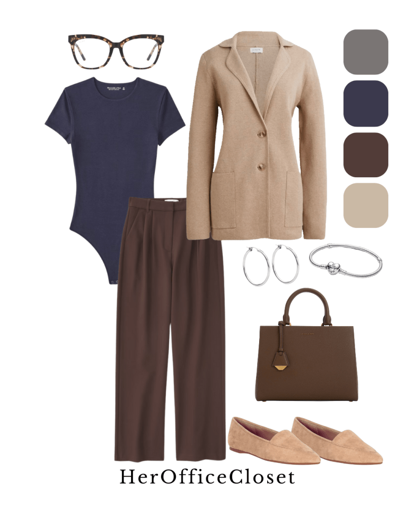This earth toned look can be pulled off with loose tailored brown pants, a dark neutral colored body suit and accenting jacket.