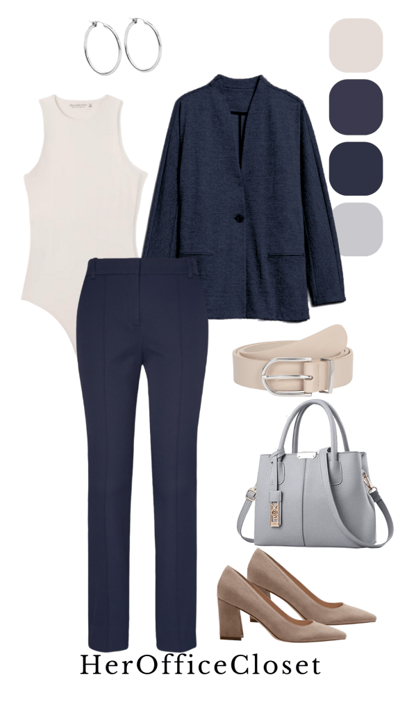Sometimes blues and black fabrics can appear slightly different in real life, to avoid this, I try and buy items of the same color scheme / fabrics from the same place. These pants and jacket are from Banana Republic Factory!